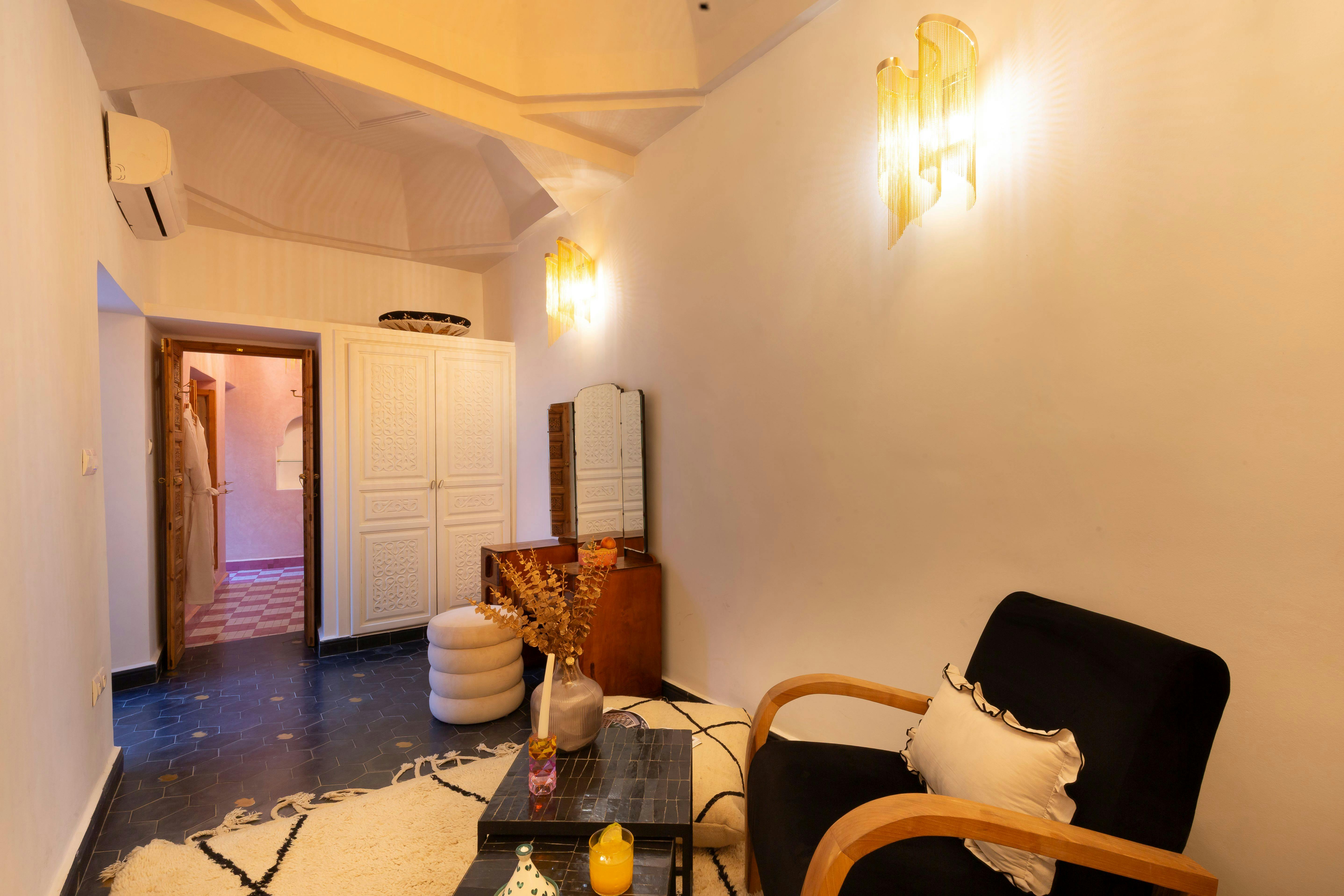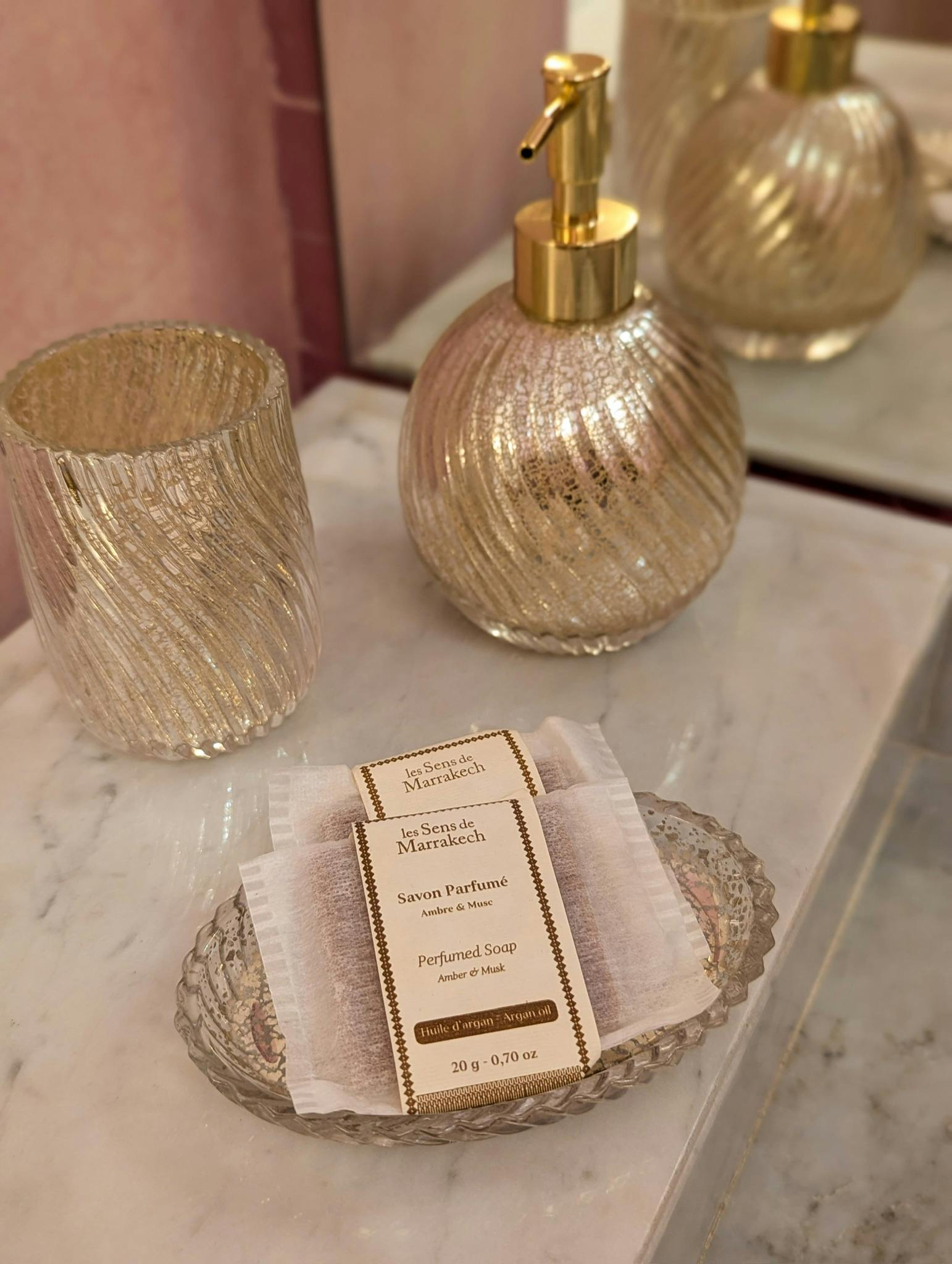 Ghazala shares a central bathroom with the adjoining Hnina room. Clad in pink tadelakt and pink zellige, accented with golden touches and crowned by a chandelier, it highlights the richness of Moroccan craftsmanship.