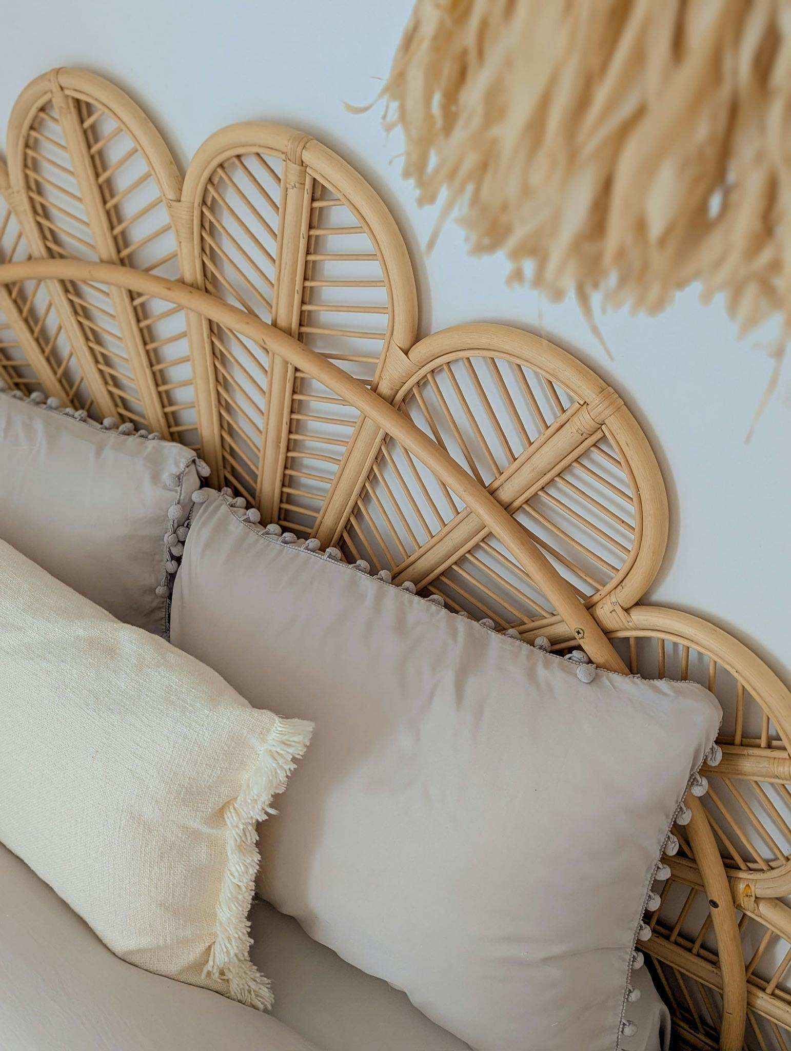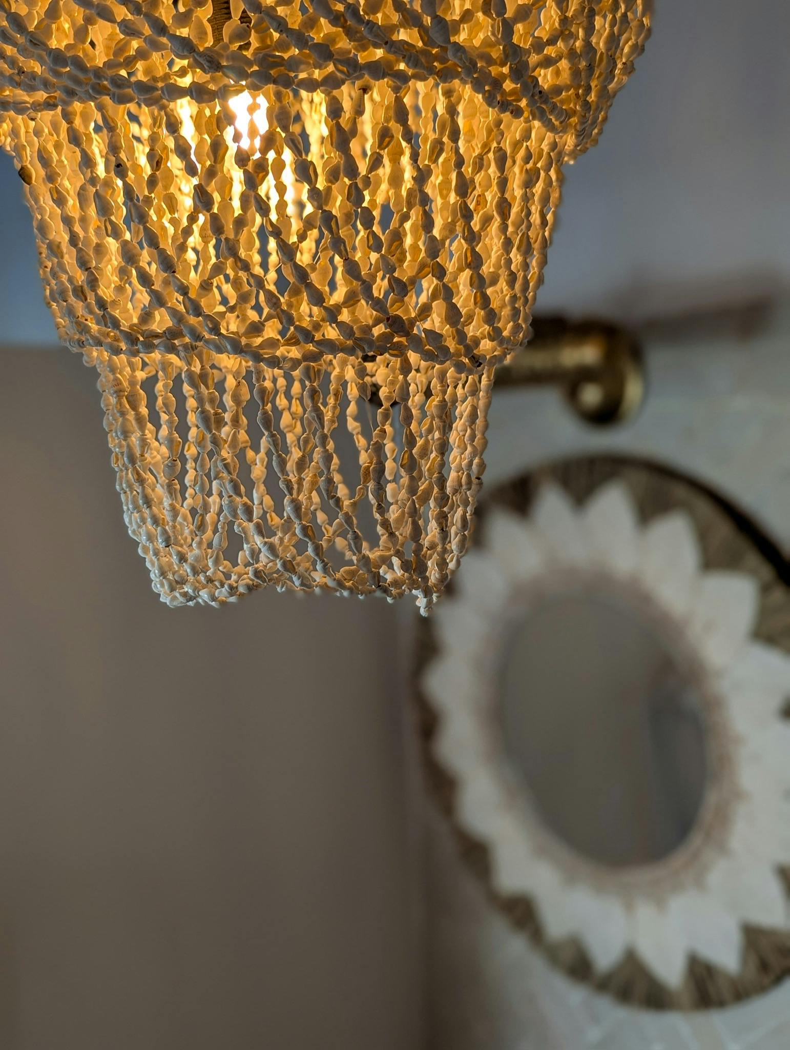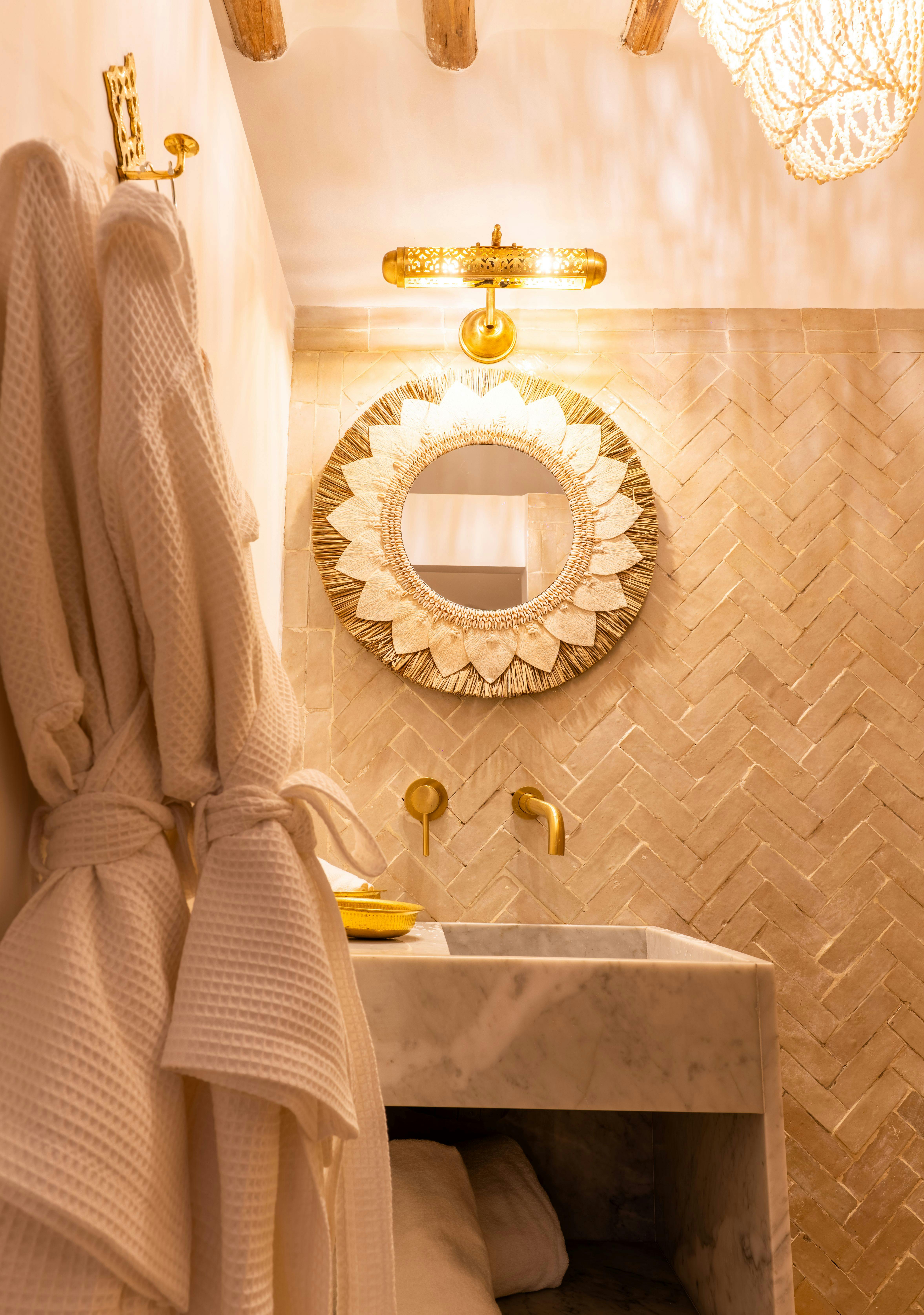 The Zouina room, which means زوينة – pretty in Arabic, is located on the terrace and reflects a bohemian spirit with a soft atmosphere. The bed features a handmade rattan headboard, while light fixtures in natural fibers and seashells structure the space.