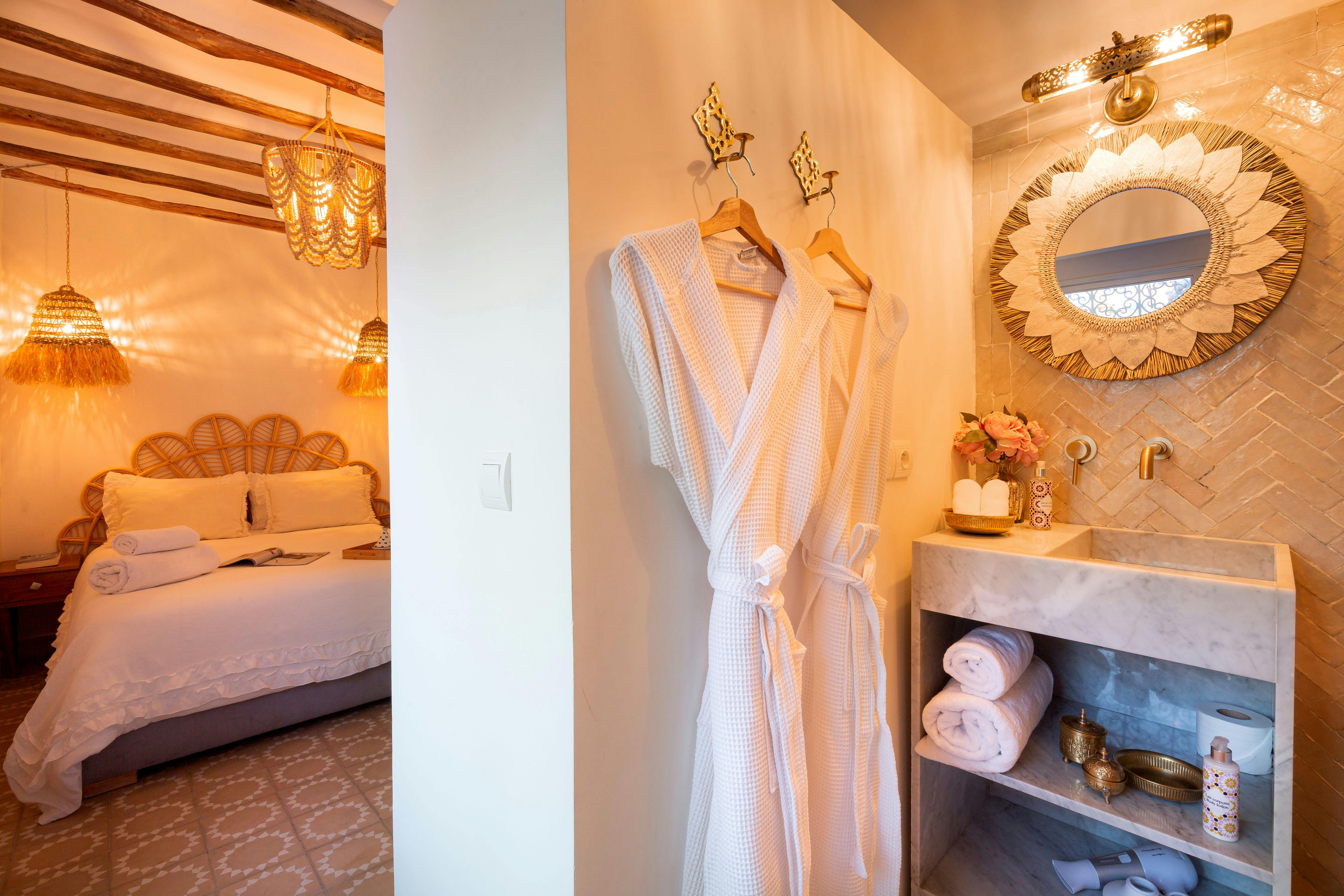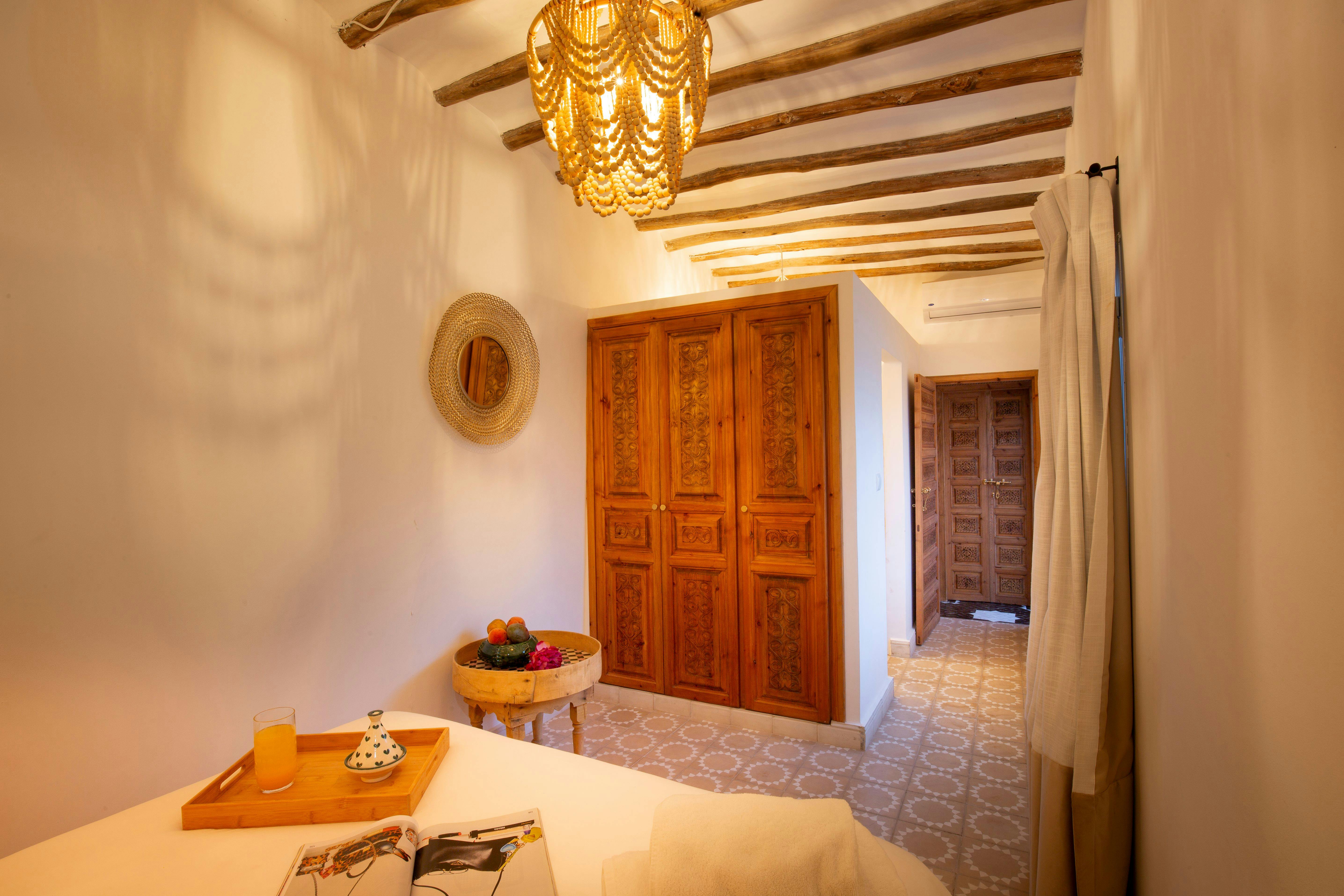 The room has reversible air conditioning and combines bohemian style with Moroccan craftsmanship in an elegant, soothing setting.