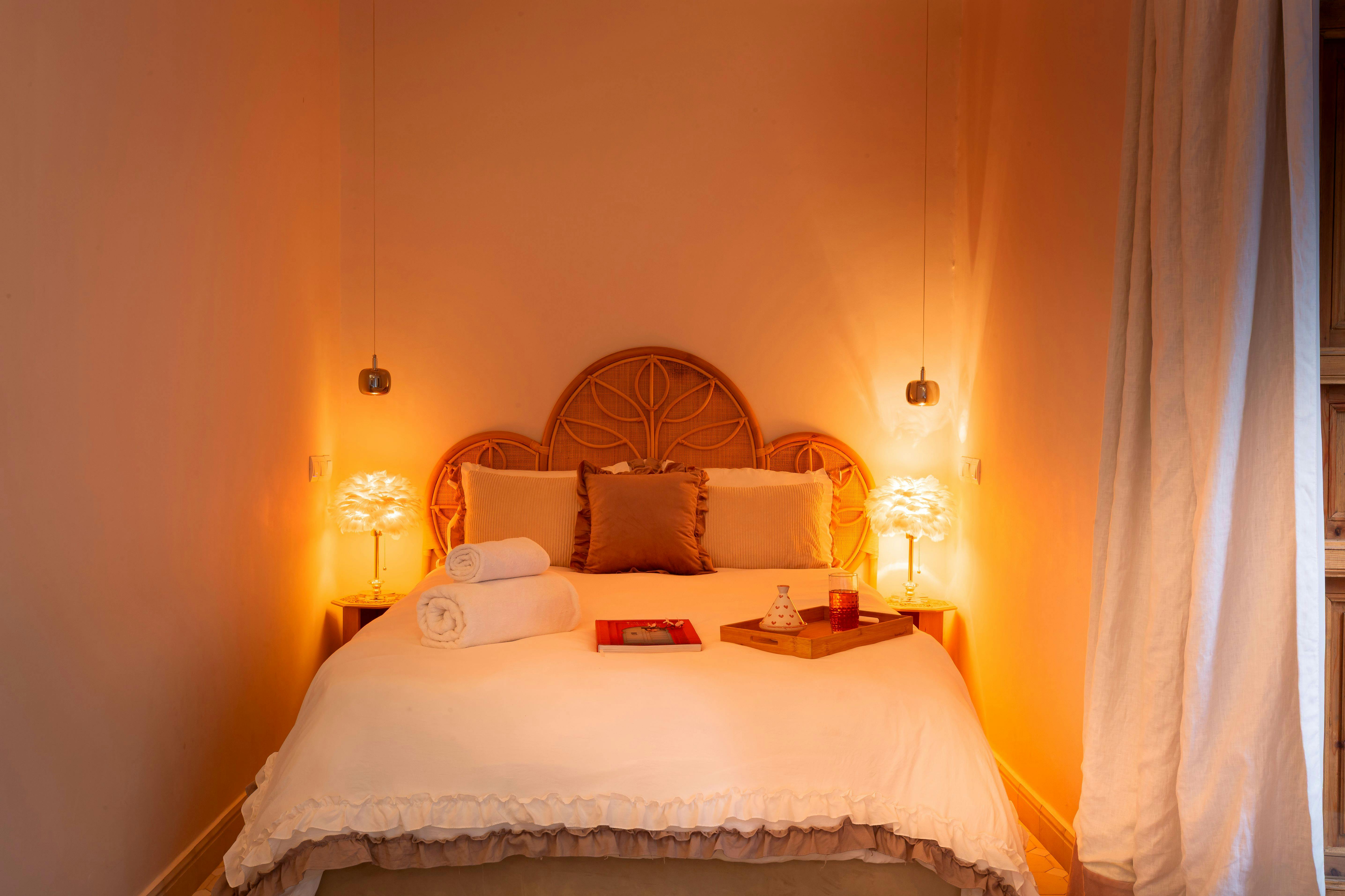 Située au premier étage, la chambre Henina, qui signifie حنينة – douce en arabe, se distingue par sa luminosité grâce à ses deux fenêtres. Le sol en carreaux de ciment incrustés de laiton s’harmonise avec les tons doux de la pièce, mêlant des nuances de rose à des détails dorés.