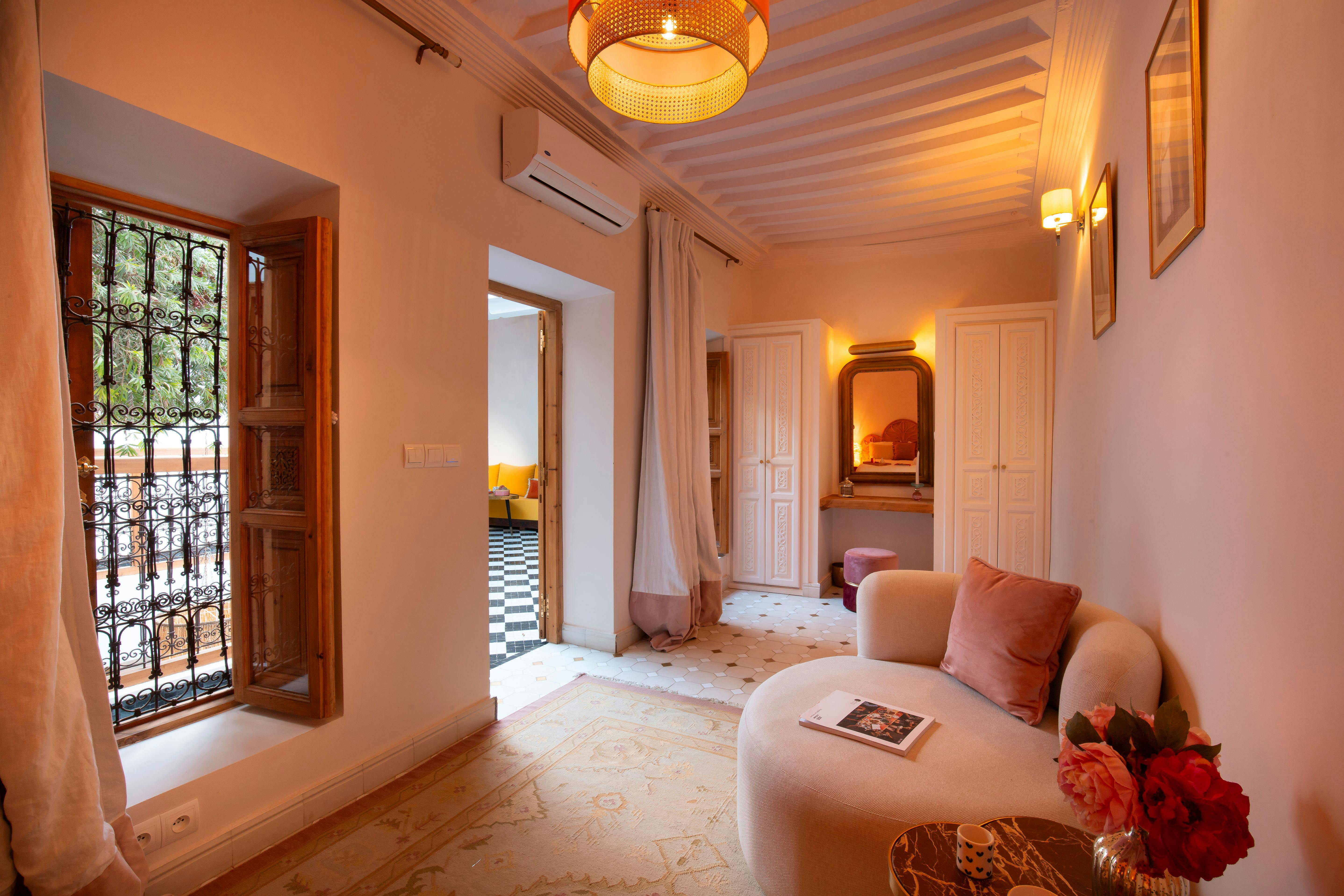 Hnina partage une salle de bains centrale avec la chambre Ghazala adjacente. Revêtue de tadelakt rose et de zellige rose, rehaussée de détails dorés et dominée par un grand lustre, elle met en valeur la richesse de l'artisanat marocain.