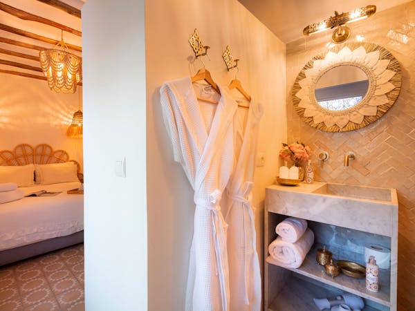 Ghazala shares a central bathroom with the adjoining Hnina room. Clad in pink tadelakt and pink zellige, accented with golden touches and crowned by a chandelier, it highlights the richness of Moroccan craftsmanship.