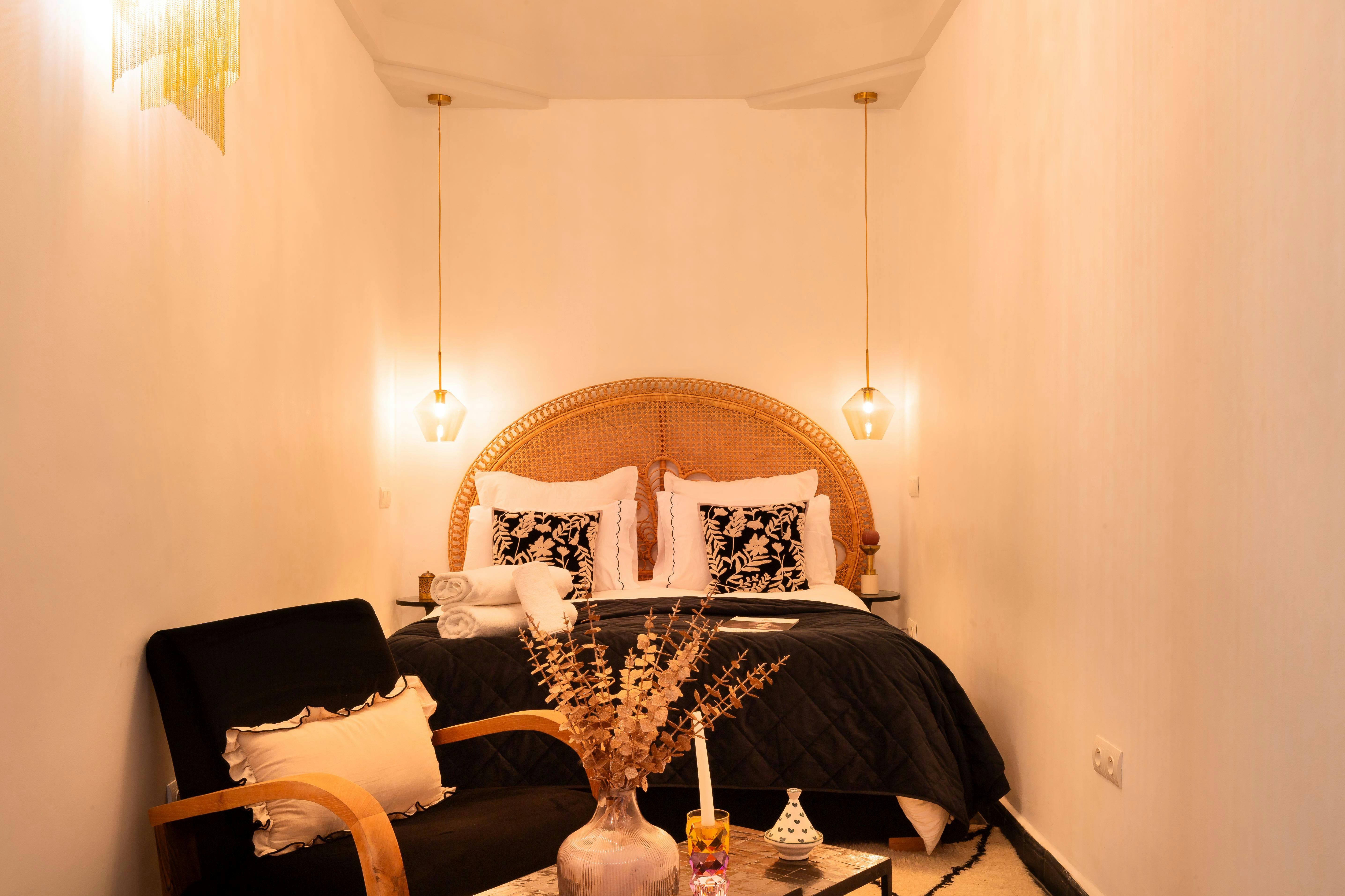 Located on the first floor, the Ghazala room, which means غزالة – beauty in Arabic, Its floor of cement tiles inlaid with brass Hands of Fatima matches the soft tones of the room, blending shades of black with golden details.