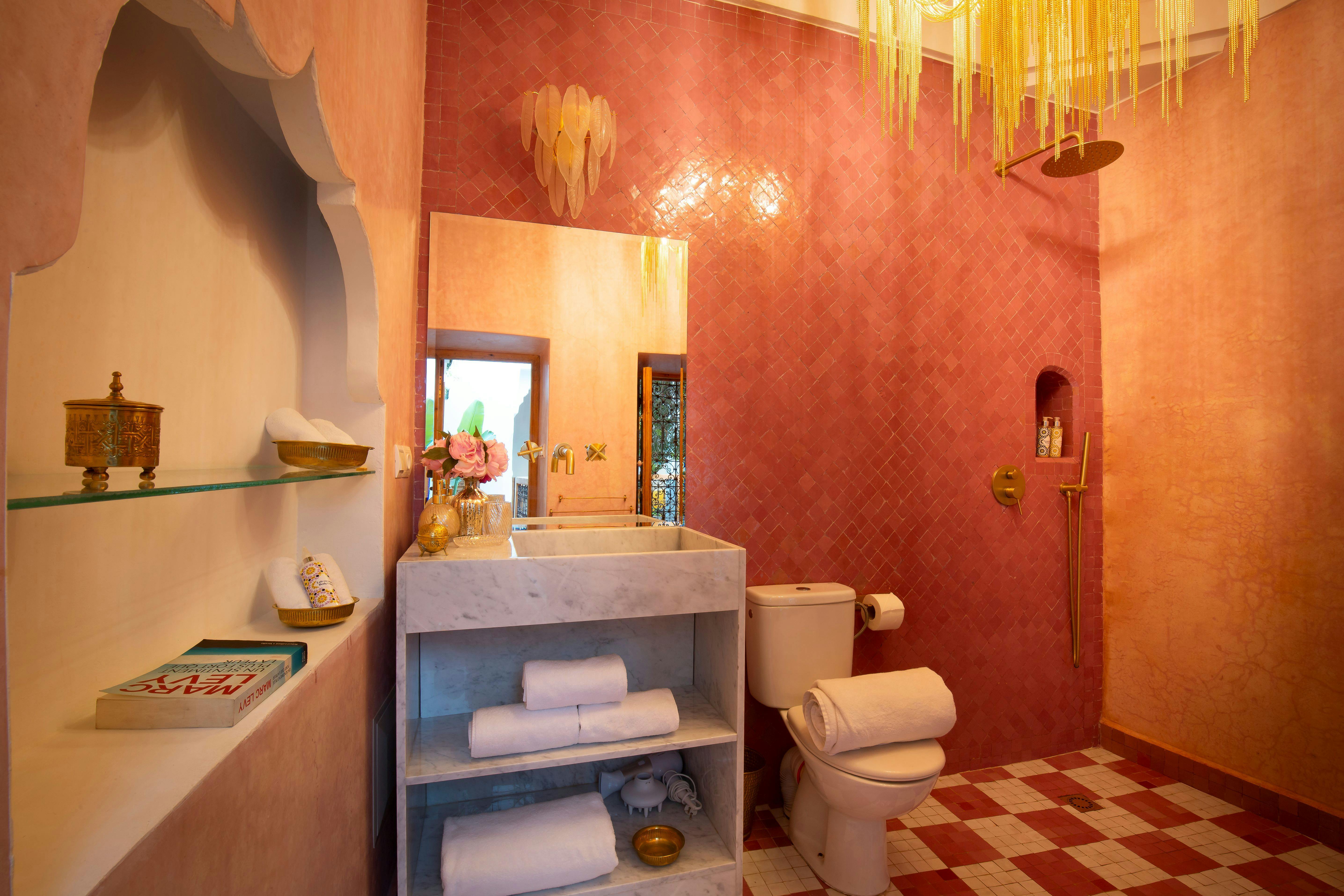 Ghazala shares a central bathroom with the adjoining Hnina room. Clad in pink tadelakt and pink zellige, accented with golden touches and crowned by a chandelier, it highlights the richness of Moroccan craftsmanship.