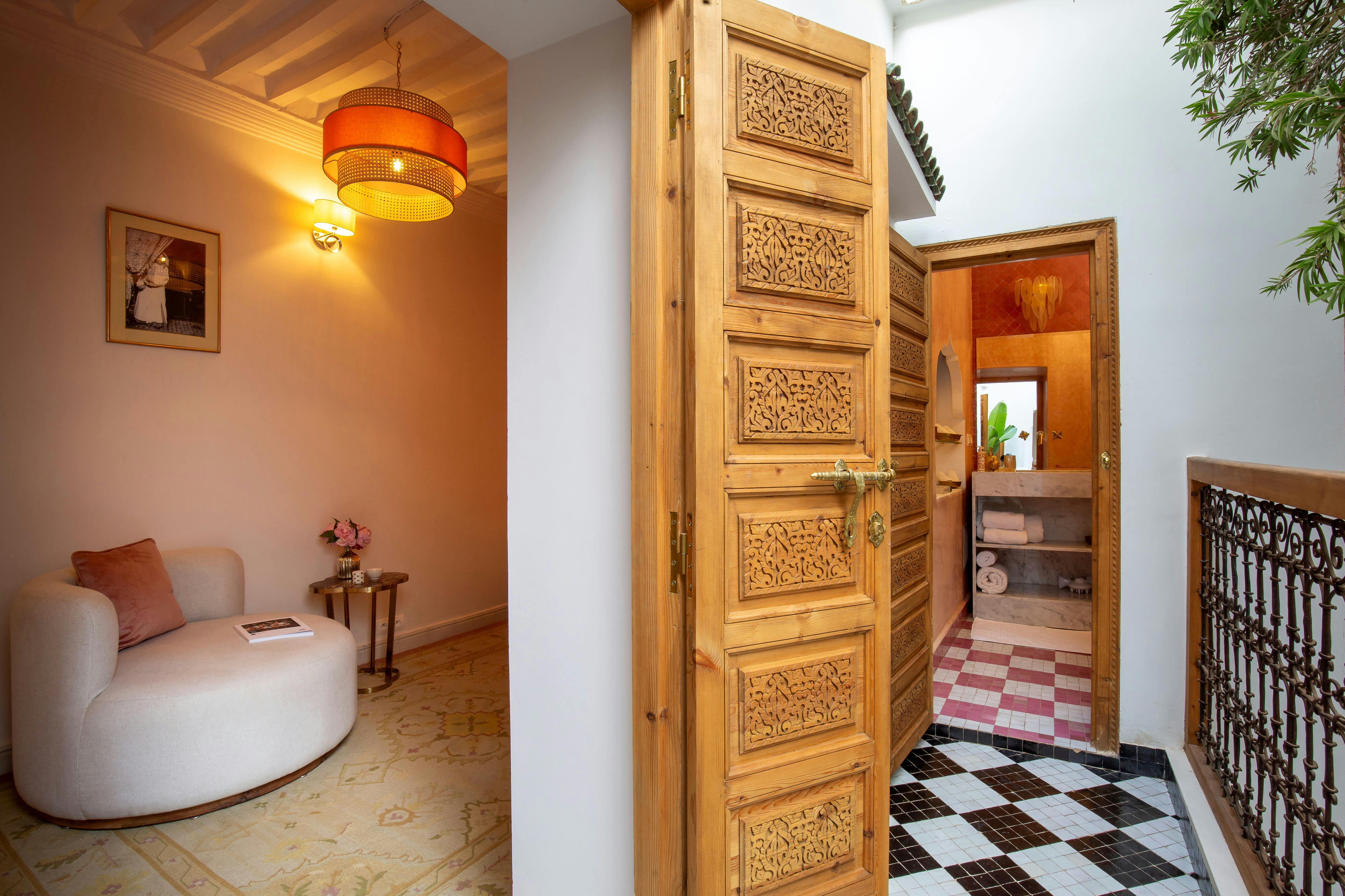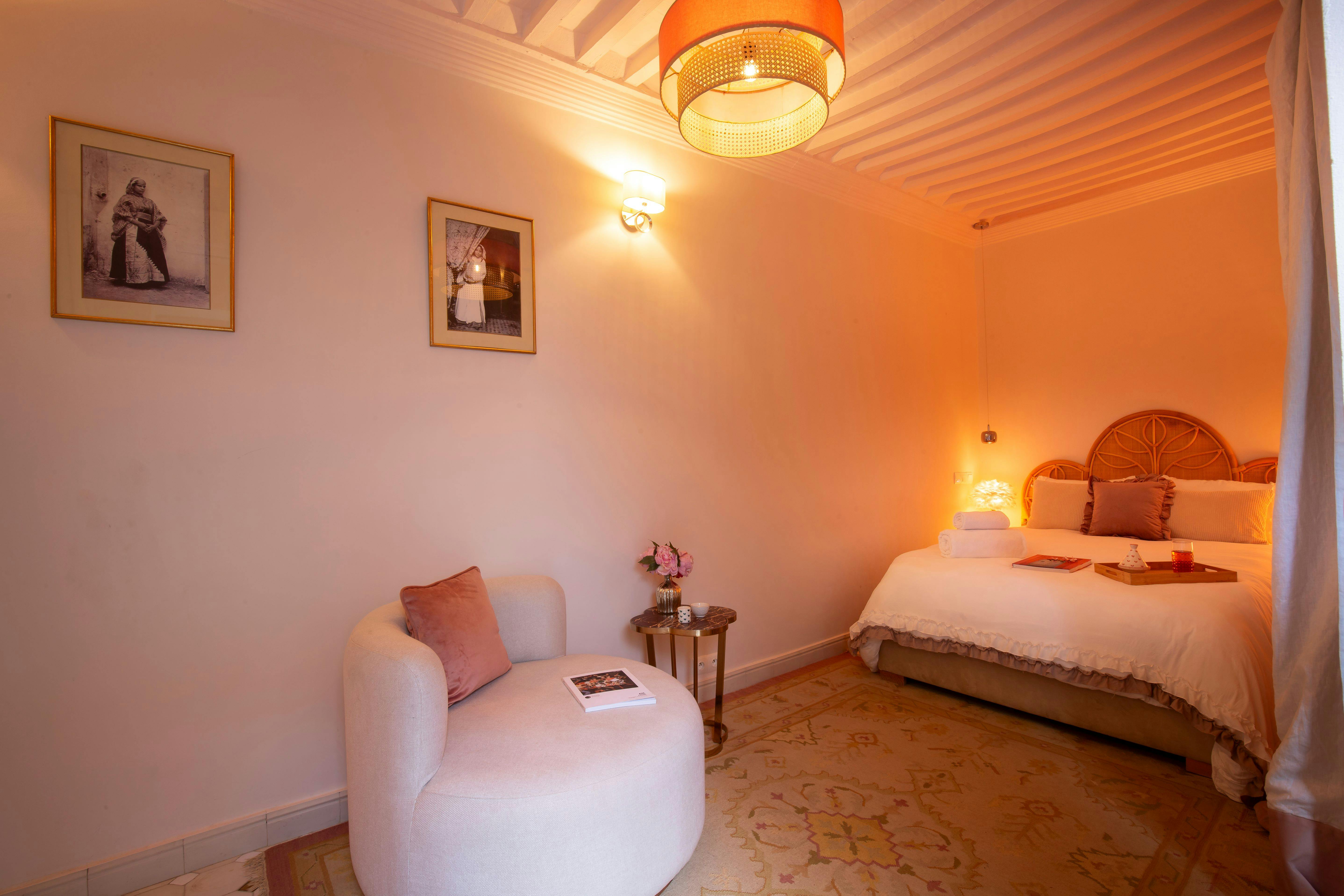 Henina shares a central bathroom with the adjoining Ghazala room. Clad in pink tadelakt and pink zellige, accented with golden details and dominated by a large chandelier, it highlights the richness of Moroccan craftsmanship.