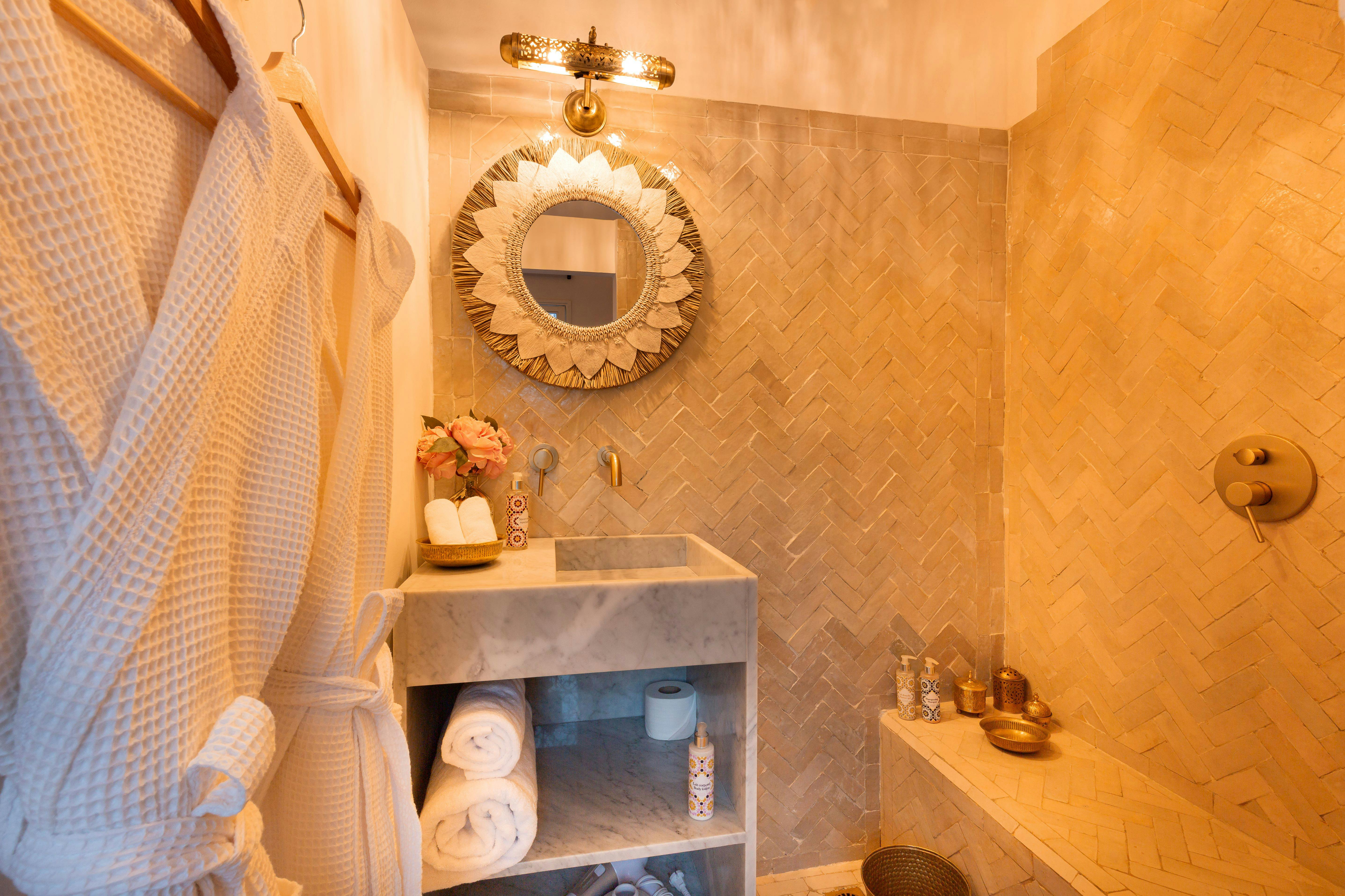 The bathroom, clad in tadelakt, is fitted with a walk-in shower in white zellige and a marble sink.